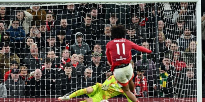Tendangan penalti pemain Manchester United, Joshua Zirkzee ke gawang Fulham di lanjutan Piala FA.(@EmiratesFACup)