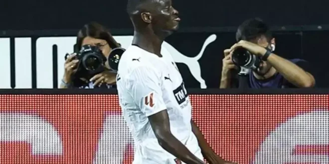 Pemain Valencia, Mouctar Diakhaby berselebrasi setelah sukses mencetak gol ke gawang Getafe pada laga pekan ketiga Liga Spanyol di Stadion Mestalla, Valencia. (Antara/Antara)