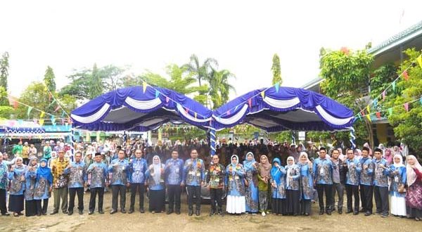 Para guru dan ratusan siswa sekolah dasar dari berbagai kecamatan di Kota Banjarmasin berfoto bersama Asisten I Bidang Pemerintahan dan Kesra Setdako, Machli Riyadi, dan Plt Kepala Dinas Pendidikan Kota Banjarmasin, Ryan Utama. Ryan Utama di halaman SDN Telaga Biru 1, Kamis (28/8), (Foto/mc/diskominfobjm).