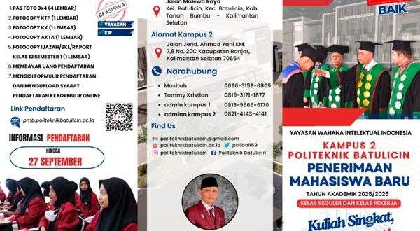 Banjarmasin, mediaprospek.com — Kesempatan emas bagi para calon mahasiswa di Banjarmasin dan sekitarnya. Kampus 2 Politeknik Batu Licin, yang berlokasi di Jl. A. Yani Km 7,8 Kabupaten Banjar, kini membuka pendaftaran mahasiswa baru untuk tahun ajaran 2025/2026. Dengan penawaran menarik, kampus ini bertekad menciptakan lulusan yang siap kerja dan profesional.