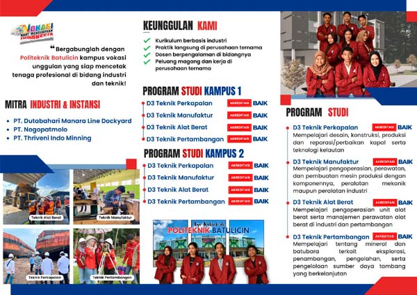 Periode pendaftaran dibuka hingga 15 Oktober 2025, memberikan waktu yang cukup bagi para calon mahasiswa untuk mendaftar. Tersedia dua pilihan kelas, yaitu Kelas Pekerja dan Kelas Reguler, yang disesuaikan dengan kebutuhan para calon mahasiswa. Politeknik Batu Licin juga menjamin kualitas pengajaran dengan menghadirkan para dosen yang memiliki keahlian di bidangnya masing-masing.