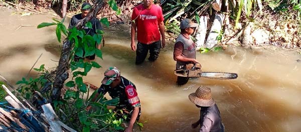 Babinsa Serka Irwan Yuliadi Bersama Warga Evakuasi Pohon Tumbang di Sungai Labuan Amas Selatan