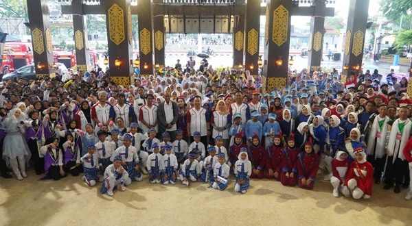Ratusan pelajar dari TK hingga Sekolah Lanjutan memadati Balai Kota Banjarmasin dalam Walikota Cup–Kejuaraan Drum Band 2025, Sabtu (29/11) sore, nampak berfoto bersama dengan Sekretaris Daerah Kota Banjarmasin, Ikhsan Budiman, dan jajaran  Disbudporapar Kota Banjarmasin. (Foto/diskominfotikbjm)